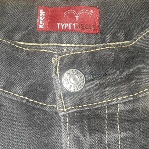 Excellent vintage condition! Made in Hong Kong super unique! Lightly faded heavy black denim with high low hem and deep pleats front and back. Small dark quarter sz spot on rear; see last pic.