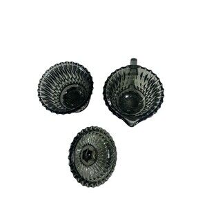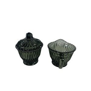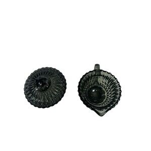 For sale is a stunning preowned Vintage Libbey Glass Creamer & Sugar Bowl Set featuring a elegant Smoke Grey Starburst Pattern, perfect for Mid-Century Modern collectors. This set includes a lidded sugar bowl and a creamer, both in excellent condition with no chips or cracks. Shows minor wear consistent with age, with possible light scratches. A beautiful addition to any vintage glassware collection!