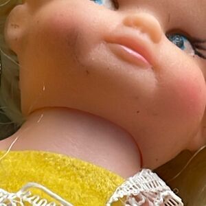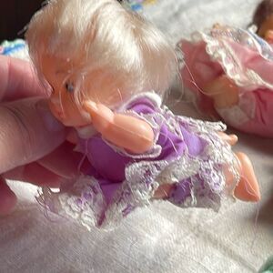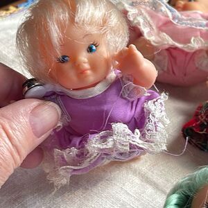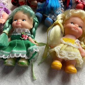 VTG. Lil Lollipop dolls. Dynatoy Co. 1960’s 70’s lot of 8 standing sitting crawling . In 1986 they were made by Playskool and labeled Sweetie pops. One of the sitting dolls has hair missing. All stamped Hong Kong. Some closures -snap are missing. Slight smudges or marks will be normal as these were played with.