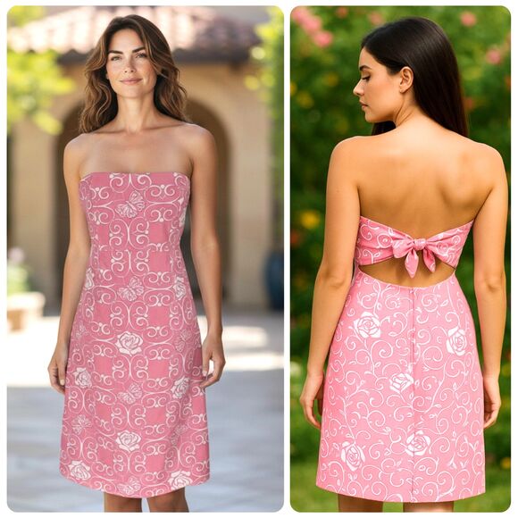Lilly Pulitzer dress, Lilly Pulitzer strapless dress, Lilly Pulitzer pink dress, Lilly Pulitzer floral dress, Lilly Pulitzer butterfly dress, Lilly Pulitzer rose print, Lilly Pulitzer summer dress, Lilly Pulitzer spring dress, Lilly Pulitzer resort wear, Lilly Pulitzer vintage dress, Lilly Pulitzer cotton dress, strapless pink dress, strapless floral dress, strapless summer dress, strapless party dress, strapless cocktail dress, pink white dress, pink floral dress, butterfly print dress, rose print dress, floral sheath dress, sheath dress women, fitted summer dress, knee length dress, 36 inch length dress, womens size 10 dress, size 10 dress women, mid length dress, back bow dress, open back dress, back tie dress, vacation dress women, garden party dress, beach resort dress, spring wedding guest dress, summer wedding guest dress, feminine dress, girly dress, preppy dress, southern style dress, iron maiden print, rare Lilly Pulitzer, discontinued Lilly Pulitzer, hard to find Lilly Pulitzer, collectors Lilly Pulitzer, boutique dress, designer summer dress, womens casual dress