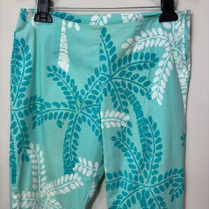 Lilly Pulitzer Teal Blue Palm Tree Capri Pants. White Label. Cropped. Side Zip. Slits at the leg hems.