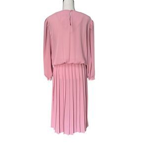 Sweet and feminine vintage pleated midi dress by Lisa II, likely from the late 80s to early 90s. Features a soft blush pink hue, crisp pleated skirt, and a statement white bib-style collar with lace trim. Elastic waistline for shape and comfort, and long sleeves with button cuffs add to its prim charm.