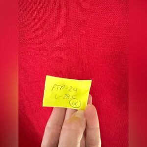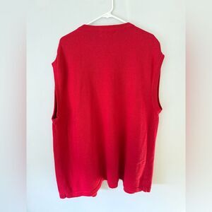Bright red sweater vest with Christmas-themed embroidery. Features snowmen, reindeer, and trees.