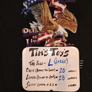 Vintage VTG Live to Ride, Ride to Live Bald Eagle & V-Twin Motorcycle T-Shirt Men's Size L (Large) by FOTL- This cool T-Shirt features a patriotic bald eagle with a stars and stripes banner flying over a classic V-Twin motorcycle with the "Live to Ride, Ride to Live" motto. T-Shirt is a Men's Size L (Large). Approx. measurements are 20 inches across the chest and 28 inches from collar to cuff. T-Shirt is 100% Cotton and was made for Fruit of the Loom in the Dominican Republic. T-Shirt is in Very Good Condition with minor wear. Please see pictures for Condition Concerns. Ships Nationwide with USPS Ground Advantage Mail. Thanks for looking and God Bless!