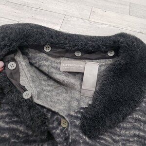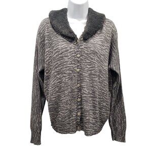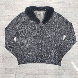 Description: VTG Liz Claiborne Lambswool Angora Blend Cardigan Faux Fur Collar Animal Print Gray Womens Petite M