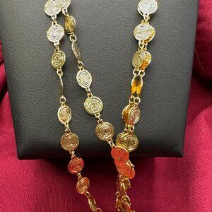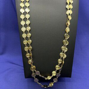 Vintage Liz Claiborne Mini-medallion gold-tone dual strand necklace with fold-over clasp. Necklace measures 32” (shorter strand) with fold-over clasp. Signed “LCI” on small hangtag. In very good pre-owned condition.