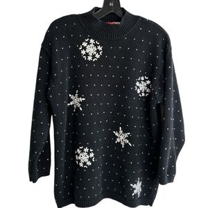 VTG Liz & Co Sweater Mock Neck Embroidered Snowflakes Medium Black Cottagecore