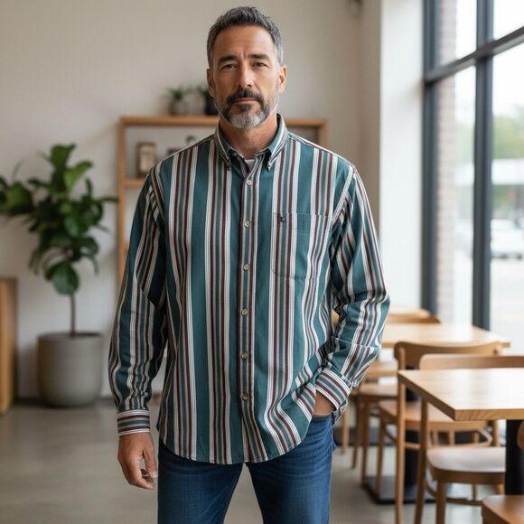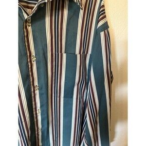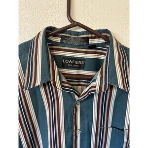 The VTG Loafers Reed & James Striped Button Up Shirt in Blue Green Red is a stylish and versatile addition to any man's wardrobe. This long sleeve shirt features a classic collared neckline with a button-down style, perfect for casual or business occasions. The colorful striped pattern adds a fun and vibrant touch, while the XL size ensures a comfortable fit. Made from a blend of polyester and cotton, this shirt is machine washable for easy care. Perfect for the summer, fall, and spring seasons, this shirt also includes pockets for added functionality. SMOKE FREE HOME