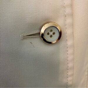 Vintage Ivory trench coat. Patch pockets. Double breasted. Some areas of staining. This coat originally came with a liner, but no longer has it.