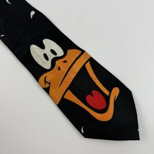 Add a touch of whimsy to your outfit with this vintage Looney Tunes Mania character tie featuring the beloved Daffy Duck. The black polyester tie is accented with a pointed style and a classic width, making it the perfect addition to any man's wardrobe. The tie is adorned with the iconic Looney Tunes logo, adding a playful touch to your attire. Whether you're dressing up for a special occasion or adding some personality to your everyday look, this tie is sure to turn heads.