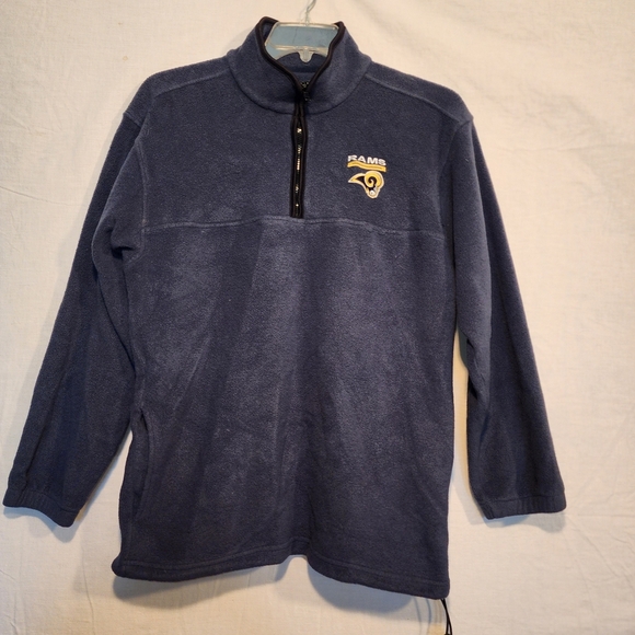 The VTG Los Angeles Rams Quarter-Zip Fleece Pullover is a men's NFL football sweatshirt in size Large, featuring the team's official colors of blue. This officially licensed pullover is perfect for fans of the Los Angeles Rams, with the team's logo and branding featured prominently. Perfect for regular season games or showcasing team pride in colder weather, this pullover is a must-have for any die-hard Rams fan.