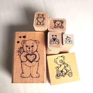 This lot of 7 vintage rubber stamps is perfect for any crafting enthusiast. The adorable teddy bear theme and heart and party designs make them a great addition to any collection. The stamps are made of high-quality wooden material and were manufactured in the United States. They can be used for a variety of crafts, including stamping and embossing on paper, fabric, and more.