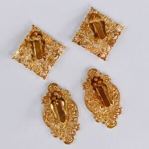 Features: Clip-on backs; ornate filigree design; bright gold-tone finish; two distinct shapes (diamond and baroque oval); vintage revival styling