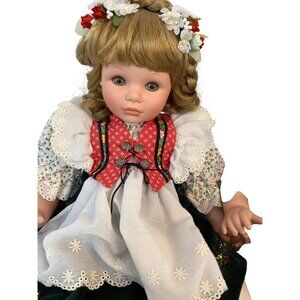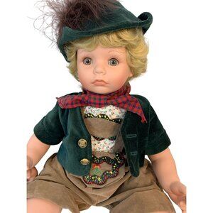 This pair of handcrafted Susan Wakeen by Danbury, Hansel & Gretel dolls showcase exquisite details, featuring European alpine outfits. A collector's treasure, these porcelain dolls combine elegance and cultural charm.