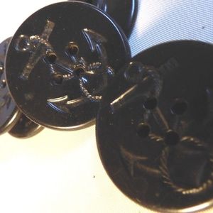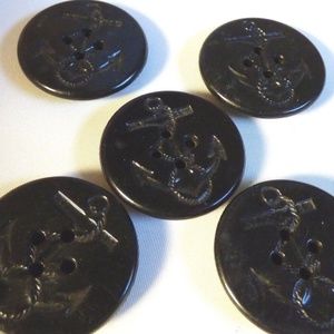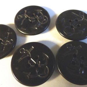 This is a lot of 5 vintage Black Bakelite Nautical Navy Anchor & Rope / Sailing 1.25" in diameter Coat Buttons