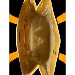 • Exterior: Embossed monogram patent leather design with natural vachetta leather handles with gold-tone LV logo rivet detailing