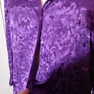 This vintage Lucie Ann II nightshirt exudes timeless elegance with its vivid purple satin fabric and intricate floral pattern. Ideal for those appreciating vintage loungewear.