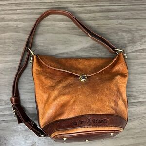 Marino Orlandi Vintage Italian leather bucket satchel bag. Cognac/brown with gold tone metal hardware. Signs of wear and scuffing & stain on front of bag all seen in pics. Minor staining inside bag. ** has rip/hole inside pocket zip as seen in pic. Price is reflective. Please look at all pics and video and comment below with any questions.