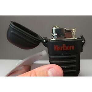 The product is a vintage Marlboro refillable butane lighter with a flip-top design. This collectible lighter is perfect for those who appreciate tobacco products like cigarettes and cigars. The Marlboro brand adds a touch of nostalgia to this unique and practical item for enthusiasts of vintage lighters. Needs fluid.