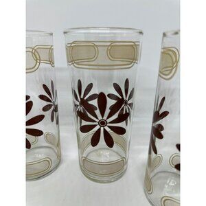 VTG MCM Brown Daisy Glass Tumblers | Set of 4, Gold Geometric Design, 6" Retro