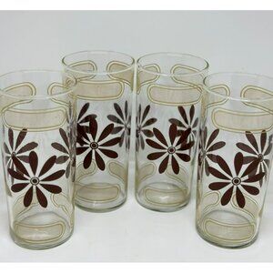 Set of 4 vintage mid-century glass tumblers featuring brown daisy motifs and gold geometric accents. Elegant and retro—perfect for entertaining or display.