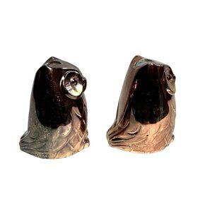 VTG MCM OWL SALT & PEPPER SHAKERS IN COPPER LUSTER FINISH 2" HIGH ORIG STOPPERS