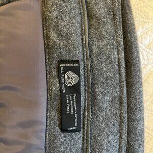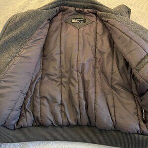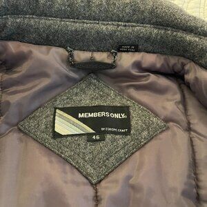 Members Only Men's Size 46 100% Wool quilted lined bomber jacket. By Europe Craft. Made in Hong Kong. Stand up collar with 2 snaps. Zip front with snaps. Two front double pockets with snapped flaps. One inside vest pocket. Measures 27" in length at center back. No wear or defects and from smoke-free home. Very warm and heavy (over 2 lbs.)