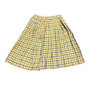 Vintage yellow mini kilt by Miss Pat, made from 100% wool. This 70's fashion skirt is a small size, adorned with a safety pin and features a mix of yellow, blue, and red. Its wrap style gives it an authentic kilt feel.