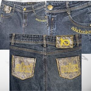Designer pockets, rhinestones, metal rivets, double stitching, embroidered designs, sequins, beads, pearls, gemstones, flap pockets, coin pockets,