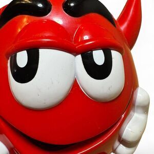 Keywords: M&M's, Red Devil, Halloween, Candy Pail, Vintage, 1999, Y2K, Nostalgia, Collectible, Holiday Decor, Trick or Treat, Plastic.