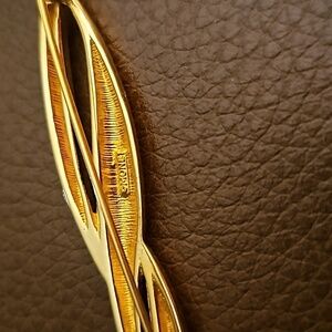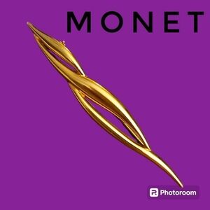 Elevate your accessory game with this vintage MONET brooch from the 1980s. This elegant piece showcases a sleek, elongated bar design with an intricate swirl pattern, all finished in a luxurious goldtone. Known for their high-quality craftsmanship, MONET's jewelry from this era is highly sought after, and this brooch is no exception. It embodies the timeless sophistication and understated glamour that defined 1980s fashion.