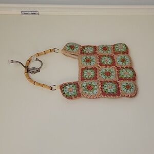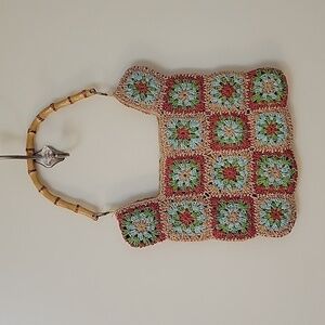 VTG Madison STUDIO Cornhusk Granny Crochet Bamboo Handle Beach Festival Bag