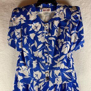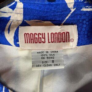 VTG Vintage Maggy London Women's Pearl Button Up Top & Skirt Blue Floral Silk Size 8 9184