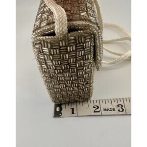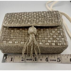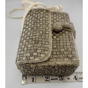 The VTG Magid Beaded Checkerboard Purse is a stylish and versatile evening bag perfect for various occasions such as weddings, parties, or formal events. This small crossbody bag features a geometric pattern with a snap closure and silver hardware accent & beaded tassel. The exterior material is made of polyester and beads, giving it a silver/gold metallic finish with a touch of 90s flair and a cream crossbody strap. The purse comes in a sophisticated silver/gold hue with a white lining, making it a chic and eye-catching accessory for any outfit.