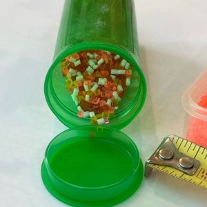 Vintage make and bake metal mushroom and shell frames to make “stained glass” sun catchers. Includes the divided container with hot pink, yellow, orange, root beer brown, amber, translucent white and opaque white melting crystals. You can see some stray crystals have gone into other sections, tweezers work well to pull them out or leave them for a cool color effect. Also a green bottle of unsorted mixed colors that had spilled.
