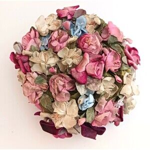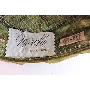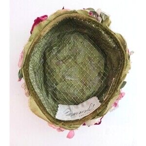 The product is a vintage Marche floral pillbox hat from the 1950s/1960s. This multi-color hat was union-made in the USA and is designed for daytime special occasions. It is adorned overall with multi color and type of artificial flowers attached to a net and tulle under structure with a stiff rim trimmed in green velvet. A tied burgundy velvet ribbon is nestled in with the flowers. One size fits all, making it a unique accessory for any woman looking to add a touch of retro charm to her outfit. The inner hat band measures 20.5" which is a size medium. Hat can be worn forward or back on the head. A hat pin was used back in the day to secure it if needed. Pre owned, clean inside and out, no missing flowers . ships boxed to you to protect the hat.