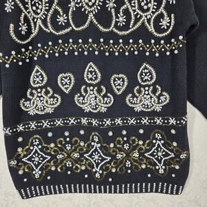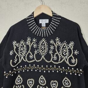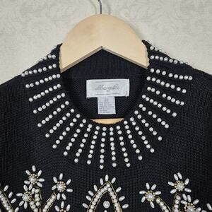 VTG Margules Sweater sz M Black Heavily Beaded Pearl Front Mock Neck Grandmacore