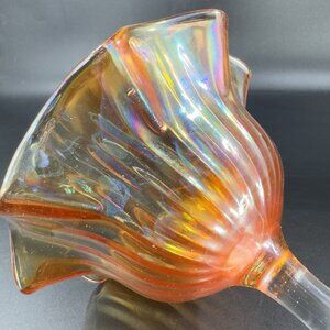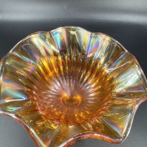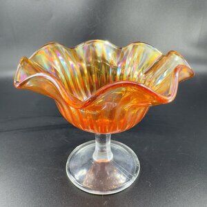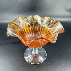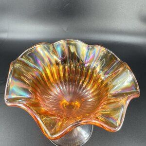 VTG Marigold Carnival Glass Iridescent Ruffled Pedestal Compote Footed Dish Bowl