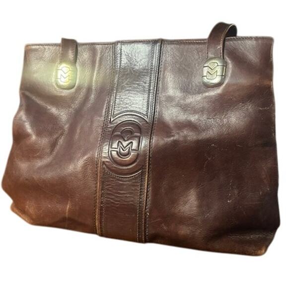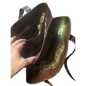 Vintage Marino Orlandi Distressed Brown Leather Tote Shoulder Bag Handbag Purse Made in Italy and in great pre-owned condition. It is vintage and it has some signs of wear and tear. Made of high quality leather, this beautiful bag has an embossed logo, double handles, gold hardware, a back zippered pocket, two compartments with zippers, an inner zip pocket, plaid lining, and impeccable stitching. Please review each picture carefully prior to purchasing to examine the typical signs of wear this vintage leather purse shows.