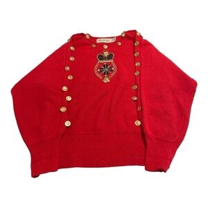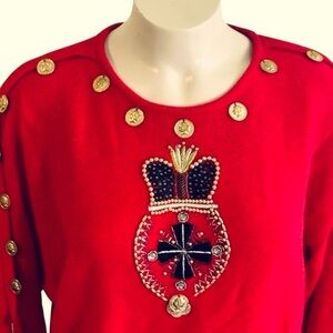 Gorgeous vintage Marisa Christina lambswool-angora blend sweater in bold red. Features gold coin buttons down shoulders & sleeves, embellished crown & crest design with beading and rhinestones. Luxe and unique statement piece!