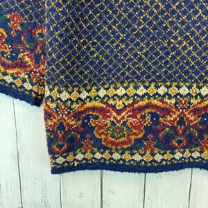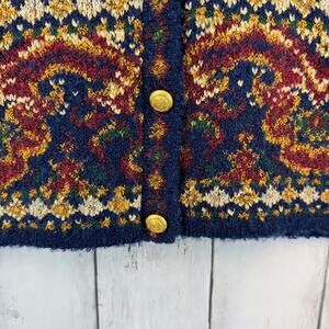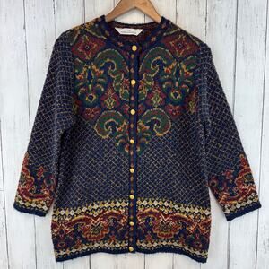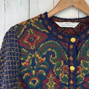 This vintage Marks & Spencer cardigan sweater features a striking baroque-inspired pattern with rich jewel tones of navy blue, red, green, and gold. The intricate tapestry knit design and ornate details evoke a bohemian and classic European aesthetic. Accented with gold-tone buttons, this sweater offers a unique, cozy addition to your wardrobe, perfect for layering or making a statement.