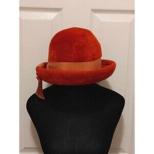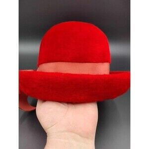 Vintage Martelle West Germany Womens Hat Red Felt Fur Fuzzy with Rolled Brim and Band accent. Body made in West Germany by Martelle and completed in USA. Measures approx. 6.5" tall and 9.5" wide by 10" long at the largest areas including the brim. Opening for the head is approx. 7.25" by 6". In Good condition with no rips, holes or stains. Has some wear and and felt/fur around the outer brim is a bit worn down around the top rim