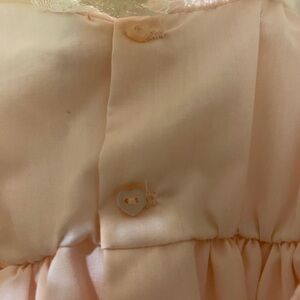 In good preowned condition especially for age. Shawl can be removed. Is attached with safety pin in front. Super cute heart button details and lace trim with bows. See small spot on back of pink dress under the shawl. Ruffled with tie bow in back.