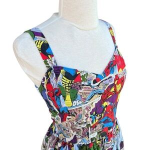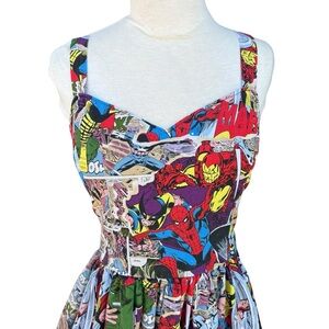 Vintage Marvel Comics Fit & Flare Skater Dress. Featuring a bright and colorful comic strip fabric featuring Spider-Man, The Incredible Hulk, Thor and other Marvel characters. Fit and flare style with a fitted bodice and sweetheart neckline, and a fuller flouncy skirt. Zip closure at back. The bodice is lined with flannel. Perfect for any comic lover or for events such as Comic-Con. The brand tag is faded. Made in USA.