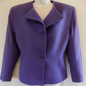 Short fitted jacket from vintage designer Mary Ann Restivo. 2 front buttons. Padded shoulders. Full purple lining. Made in the USA. ILGWU label. Ladies 4