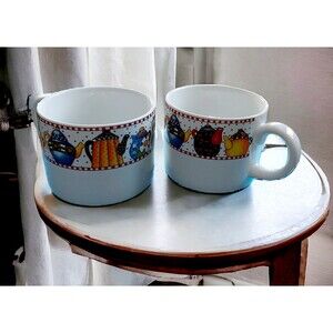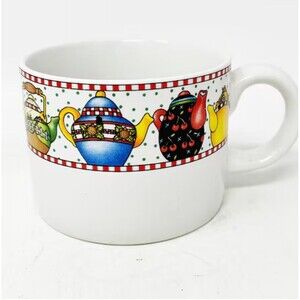 Vintage Mary Engelbreit Sakura Afternoon Cups,q must-have for collectors of unique decorative items. Made of high-quality ceramic and porcelain materials, this cup features a colorful design of tea pots on a white background. It was produced in Indonesia in the 1990s and is an original, rare item from the artist. The cup is perfect for short coffee or tea breaks and will add a touch of whimsy to any collection. Its age is from 1994 and is made of stoneware.