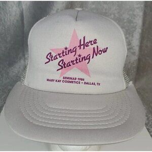 VTG Mary Kay Hat Seminar 1986 Cosmetics Dallas Texas Gray Mesh Foam Star Cap Hat is in good condition, there may be some light soiling and general wear...see pics for full clarity of condition regarding this hat...there is a bit of lose thread around left side brim/crown meeting **fast handling, detailed shipper** HAT SHIPS IN BOX