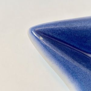 Light wear, scratches, shelf wear on the bottom, and small chips on the: left side in the blue area, top left point in the blue area, right side point in the white area and one on the bottom ridge. Bottom left point has fine hairline cracks on the side and underneath.