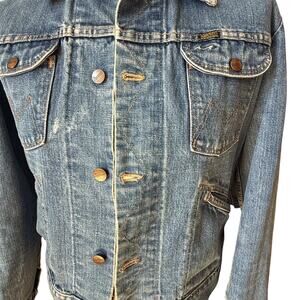 For sale is a vintage men's Maverick Blue Bell jean jacket in a size 42. Please refer to the measurements to determine fit.