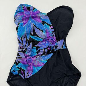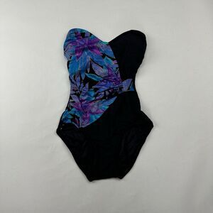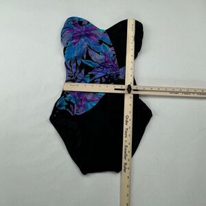 Get ready to hit the beach in style with this vintage Maxine of Hollywood strapless one-piece bathing swim suit in size 10. The colorful floral pattern and gold details make this swim suit a standout piece. The sleeveless design and strapless fit provide a comfortable and flattering look for any body type. Made of a comfortable blend of nylon and spandex, this swim suit is easy to care for with hand wash only. Perfect for a tropical beach day, this swim suit is a must-have for any fashion-forward woman's wardrobe. Don't miss out on the opportunity to add this unique and stylish piece to your collection.